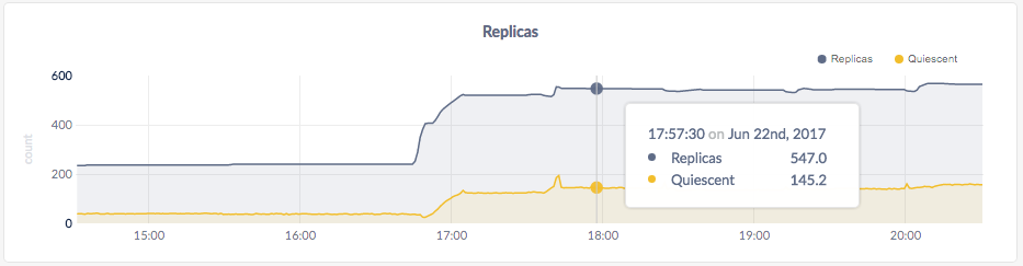 As mentioned earlier, CockroachDB automatically replicates your data behind-the-scenes. To verify that data written in the previous step was replicated successfully, scroll down to the Replicas per Store graph and hover over the line: