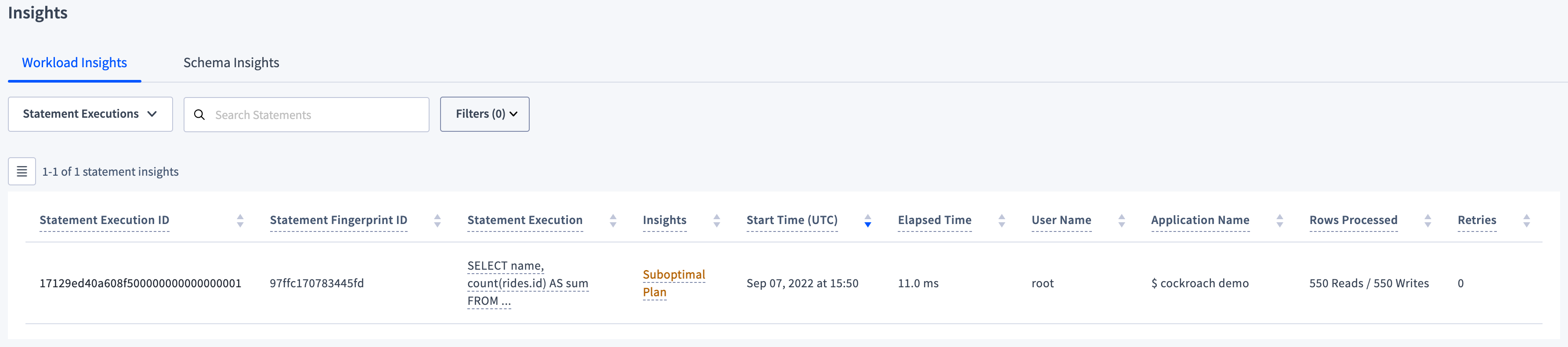By default, the Workload Insights view shows all statements or transactions that have insights. By default, the Schema Insights view shows all Schema Insights.